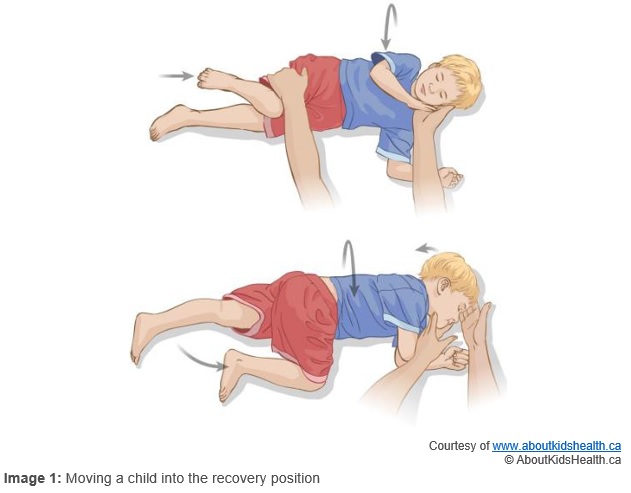 3. Ease the child onto the ground and place them on their side. This “recovery position” helps keep the airway clear and allows saliva or vomit to drain out of the mouth, preventing aspiration.
